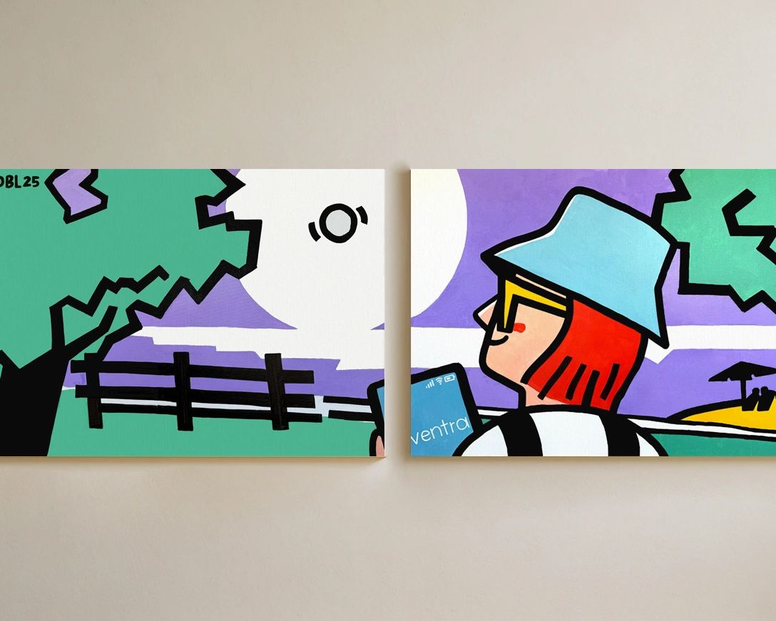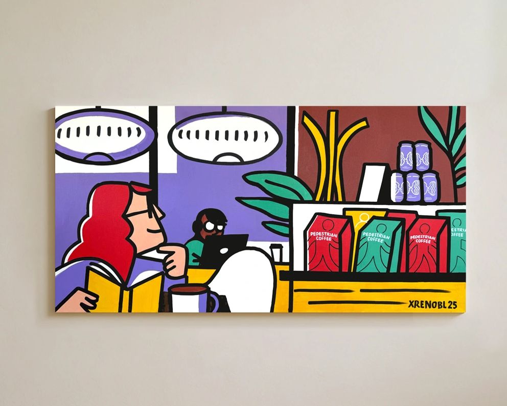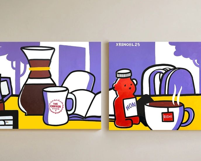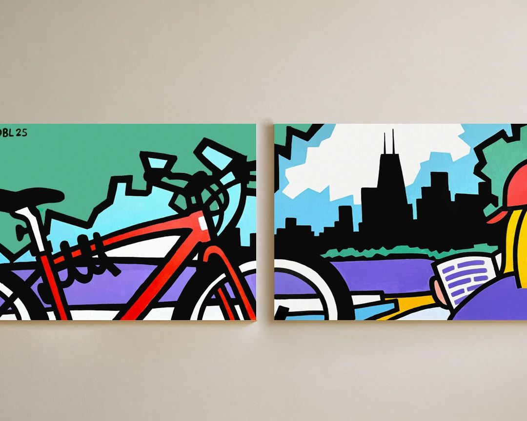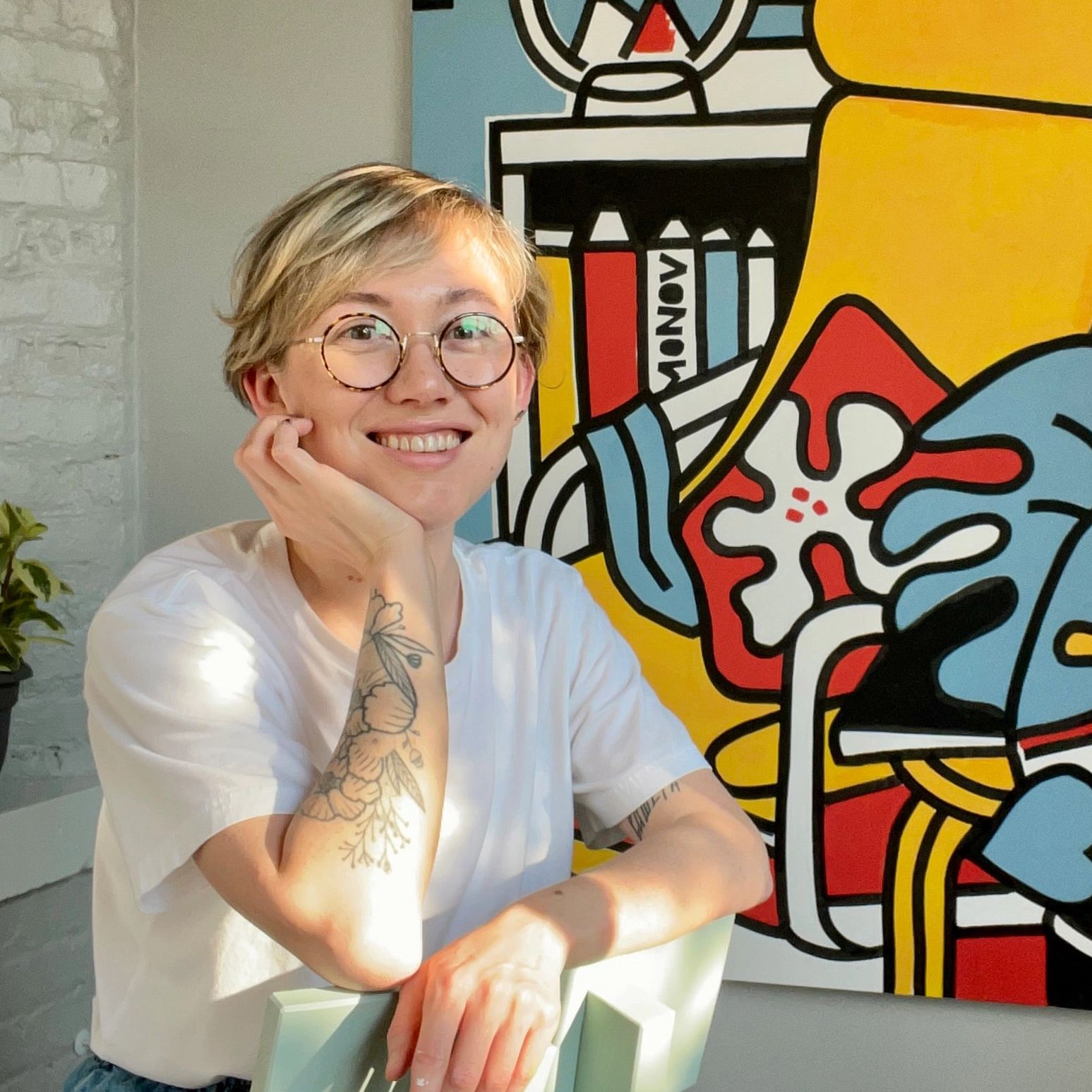 is a Chicago-based artist and illustrator in Andersonville. Working in mixed media on canvas, she distills everyday moments into vibrant graphic canvases with bold lines and bright colors, transforming small routines into energetic celebrations of daily life. She’s open for mural commissions.